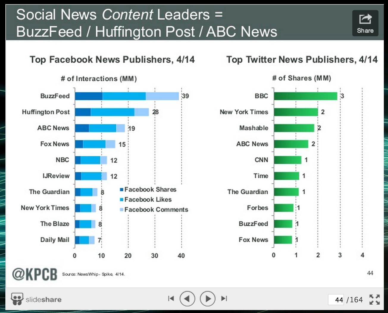 It may seem like common sense that publishers made up of aggregated content – sites such as Buzzfeed or the Huffington Post – lead on community-oriented networks like Facebook. Likewise, news sources that are more journalistic and editorial, such as the BBC and the New York Times, lead consumption on Twitter, a platform where the instant feed promotes up-to-the-minute news consumption.