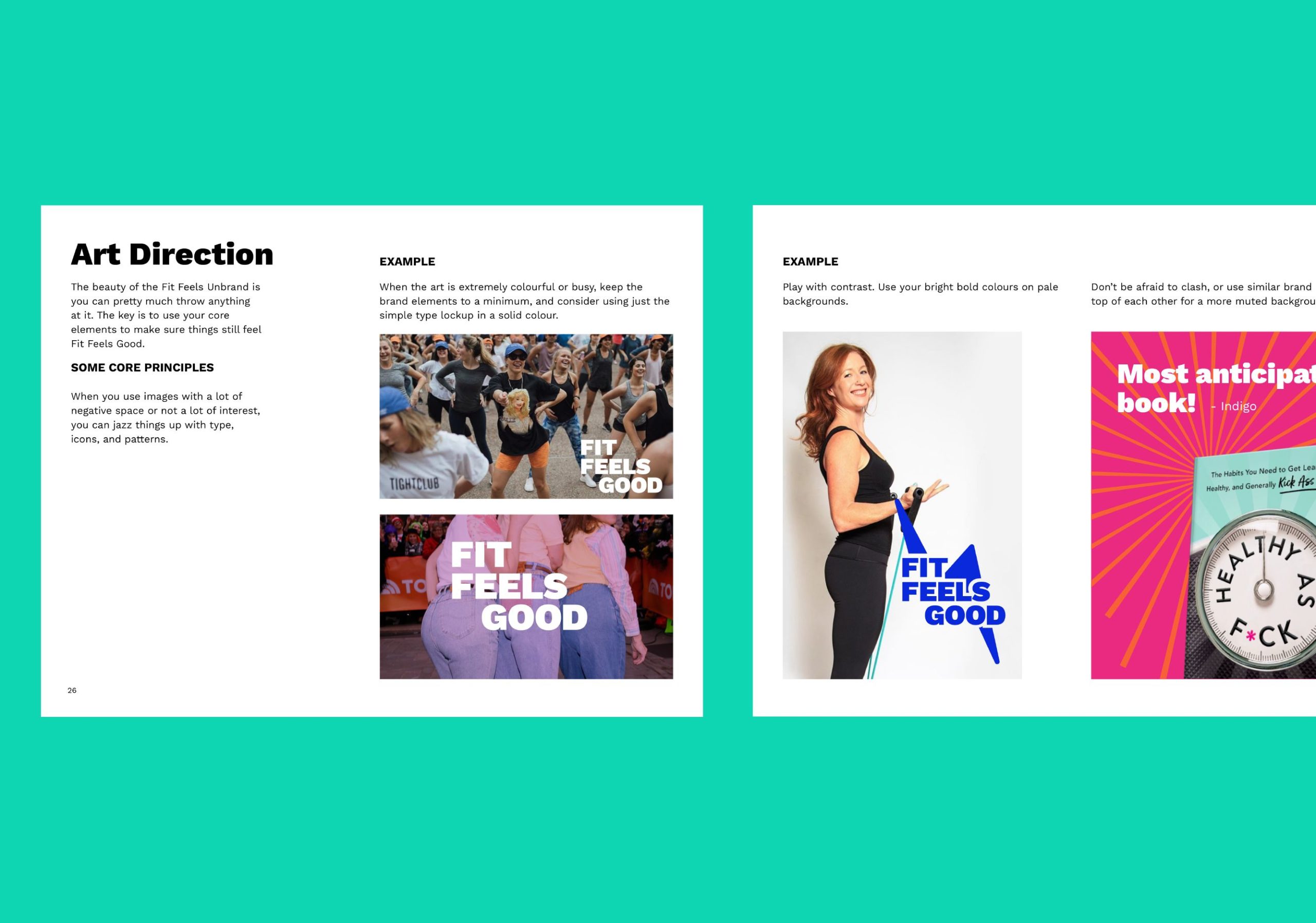 We focused on the idea of a strong core. If the core elements were strong, the rest of the elements could be experimental and fun and different. We gave Fit Feels Good strong type, bold colours, and a very simple hierarchy and icon system, so that they could go to town with their leg warmer aesthetic.